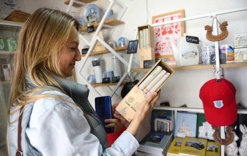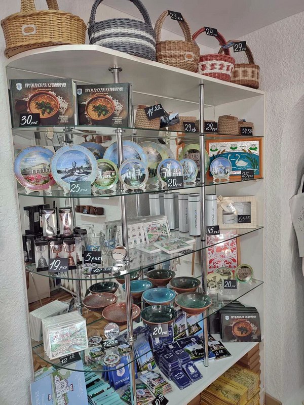 Сладости, открытки, книги, картины, ручки, магниты, футболки, кепки, сувенирные тарелки, бокалы в память о Пружанах и в стилистике значимых объектов города и района.