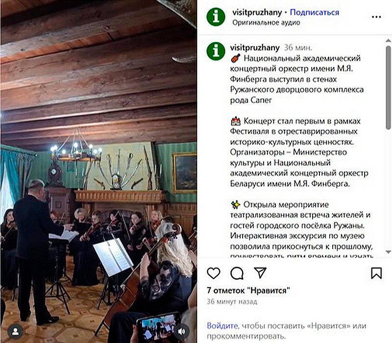 Открыла мероприятие театрализованная встреча жителей и гостей городского посёлка Ружаны. Интерактивная экскурсия по музею позволила прикоснуться к прошлому, почувствовать ритм времени и узнать больше о культурной роли рода Сапег. И, самое главное, для гостей в исполнении струнного оркестра под управлением Максима Рассохи прозвучали произведения белорусских композиторов.