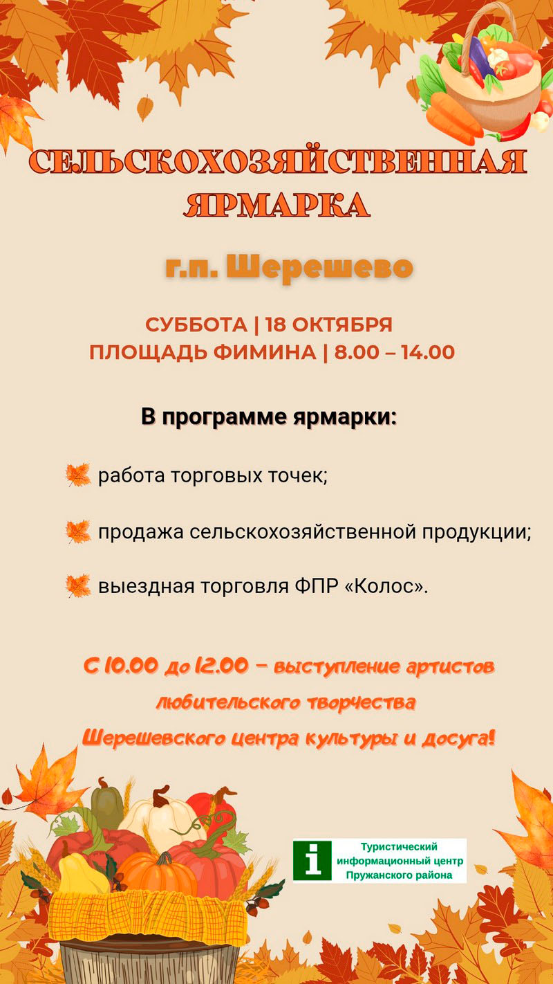 В эту субботу, 18 октября, для жителей и гостей городского посёлка Шерешево Пружанского района пройдёт осенняя сельскохозяйственная ярмарка.