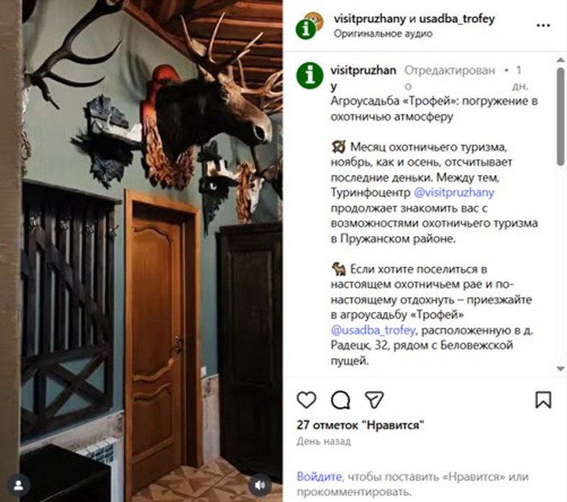 Если хотите поселиться в настоящем охотничьем рае и по-настоящему отдохнуть – приезжайте в агроусадьбу «Трофей», расположенную в д. Радецк, 32, рядом с Беловежской пущей.